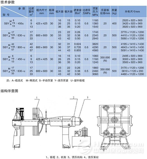 BY型板框壓濾機(jī)分手動(dòng)型和自動(dòng)型兩種,自動(dòng)型具有自動(dòng)壓緊和拉開(kāi)板框的功能,并且濾室有壓榨隔膜,絞不帶壓榨隔膜的濾餅含水率降低10%左右。