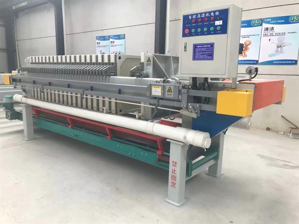 接下來(lái)把過(guò)濾介質(zhì)鋪沒在濾板上,料漿通過(guò)中心或環(huán)狀加料管導(dǎo)入濾板上表面,進(jìn)行連續(xù)過(guò)濾。當(dāng)過(guò)濾進(jìn)行到所要求的濾餅產(chǎn)量或由于濾餅的阻力使過(guò)濾速率低到預(yù)定值時(shí),過(guò)濾過(guò)程結(jié)束。某些水平板式壓濾機(jī)在底部設(shè)計(jì)了_板。過(guò)濾過(guò)程結(jié)束后,必然有一些殘存料液,可月洗液置換或空氣吹除。洗滌和反吹過(guò)程如同加壓葉濾機(jī)。卸料時(shí),將濾板組件從殼體內(nèi)抽出后刮除濾餅。有些壓濾機(jī)在適當(dāng)位置設(shè)計(jì)了水噴頭用來(lái)沖洗濾板。